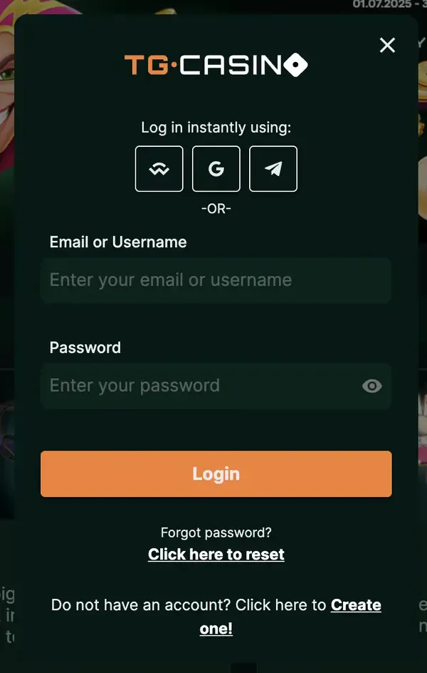 Du kannst Tg Casino direkt über deinen Webbrowser auf Desktop oder Mobilgerät nutzen. Wir bieten keine iOS- oder Android-App an, daher verwendest du für Kontozugang und Updates immer die offizielle Website. Am Smartphone läuft Tg mobiles Gaming im Browser mit demselben Konto, derselben Wallet und denselben Promotionen wie am Desktop. Wenn du die Login-Seite öffnest, gib die E-Mail und das Passwort ein, die du bei der Anmeldung festgelegt hast, um den Tg-Login abzuschließen.